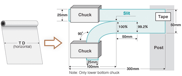 - Caralyan Y that has been stored in an isothermal room (23±2 ℃, 50±5% humidity) for 1 day is cut in the TD direction 50 x 300 mm, and a slit is inserted at 100 mm in the center.
