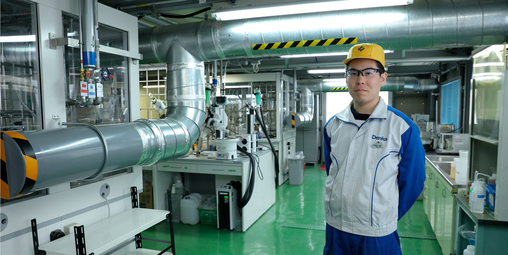 就職希望は、当初から化学メーカー一本に絞っていた。最終的にデンカに決めた理由は事業内容の幅広さ。事業分野に有機化学も無機化学も持っていて、それでいて働く人の顔を覚えられるほどに、適度な企業規模である。研究を進める上で、他分野の知識が必要になることを見越し、さまざまな分野の人と協働する環境を求めデンカに入社を決めた。